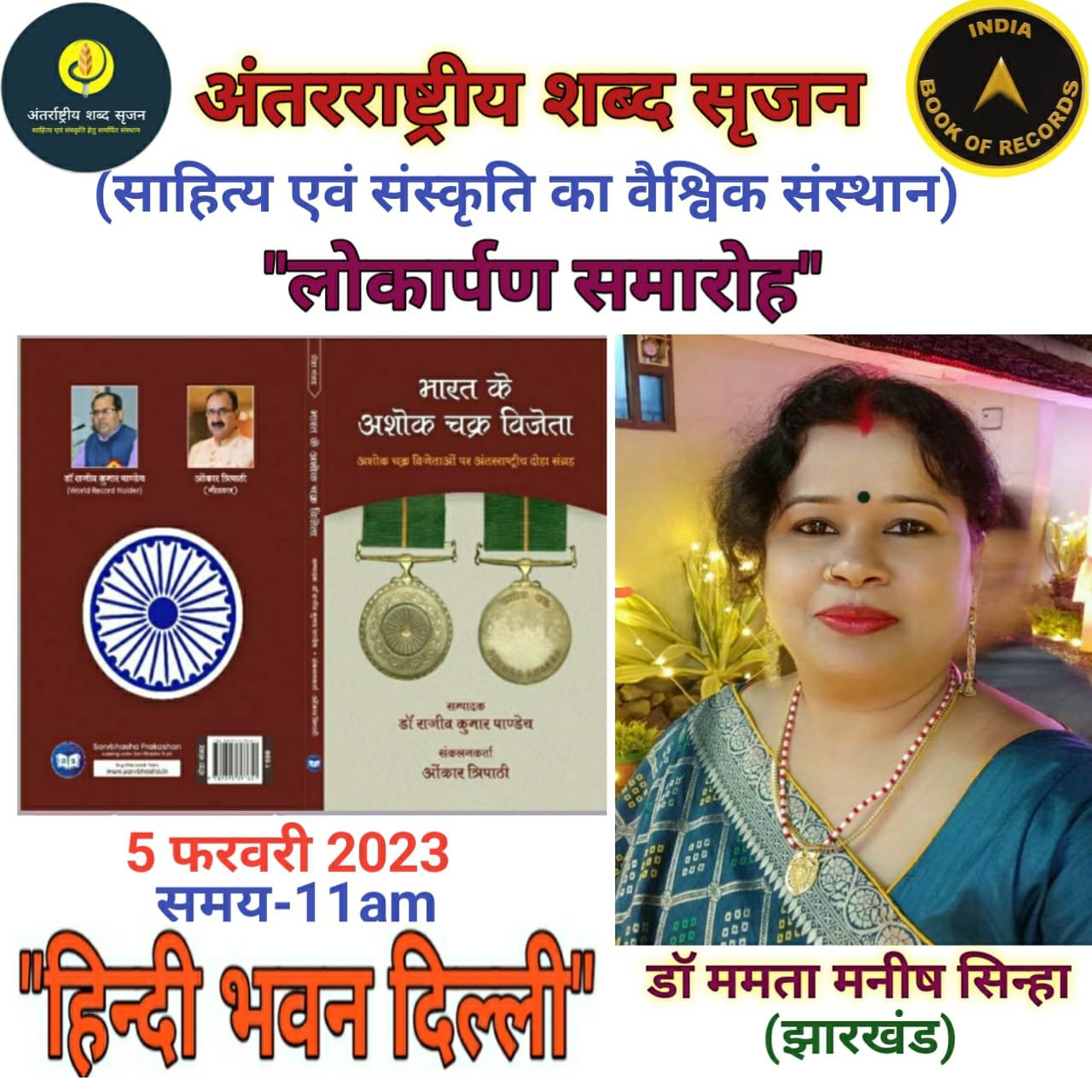 झारखंड की कवयित्री ममता मनीष सिन्हा हिंदी भवन दिल्ली में ’काव्य श्री सम्मान’ से होंगी अलंकृत , कविता हुई इंडिया बुक ऑफ रिकॉर्ड्स में शामिल’